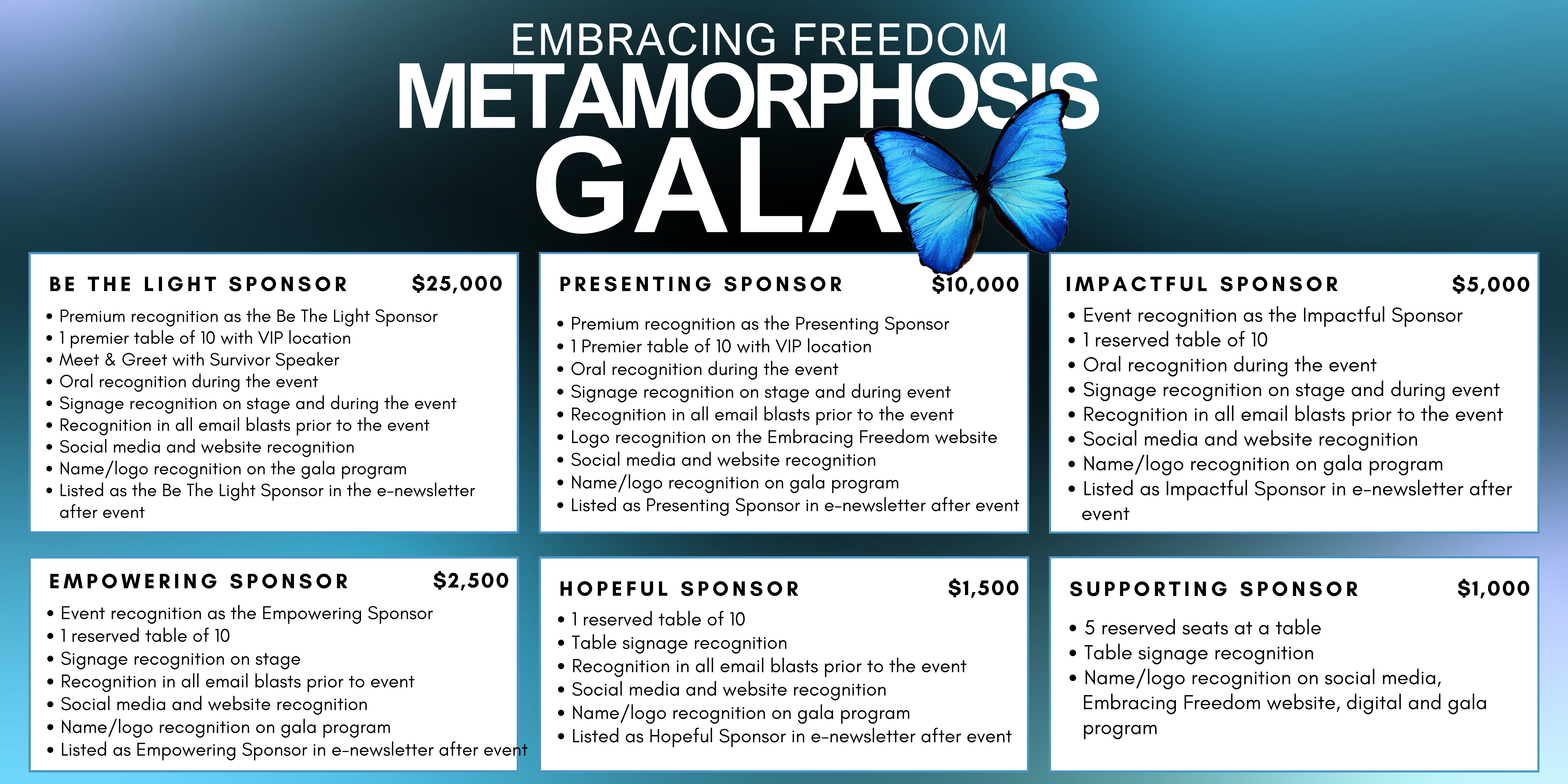 Your sponsorship helps fuel Embracing Freedom’s mission to rescue, support, and restore lives. With a variety of table sponsorship packages available, each offers meaningful opportunities for recognition and engagement. Proceeds directly sustain programs that empower survivors on their journey toward healing and independence.